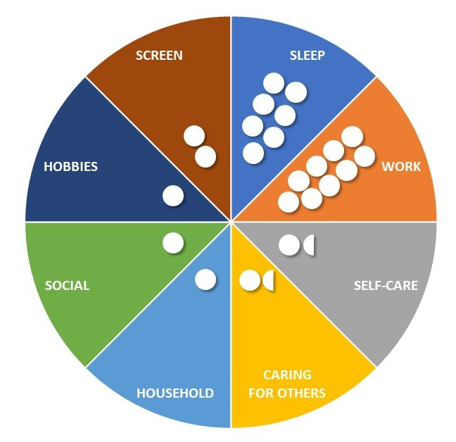 A friend of mine took part in a “time management for upcoming parents” course. She and her husband had to visually show how they currently spend their 24 hours per day, and then try to fit in 8 hours of babycare. The result surprised them, and turned out to be a great conversation starter.